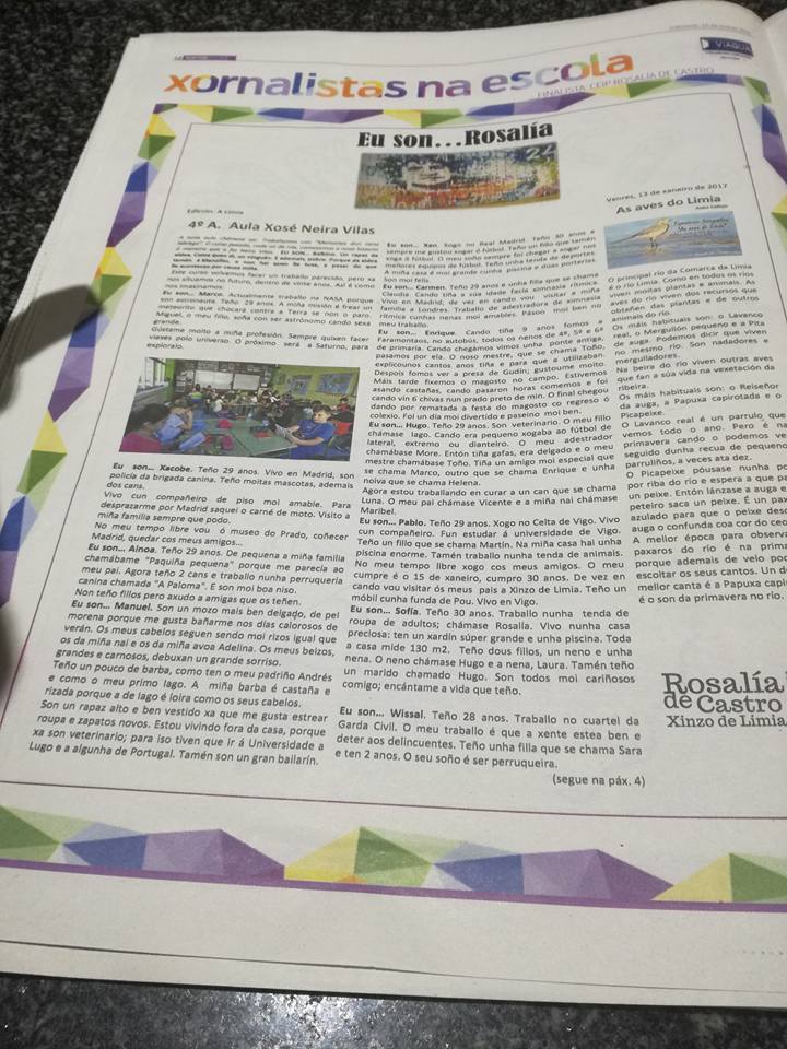 Este pasado mércores, 15 de marzo, atopamos que no suplemento de La Región "Xornal escolar" aparecía o traballo feito, para participar neste concurso, da aula de 4º A do Ceip Rosalía de Castro. Recibimos a nova cunha gran alegría porque somos, un ano máis, finalistas. Se lle queredes botar unha ollada poñemos aquí o enlace ao noso "Eu son... Rosalía" que tivemos que mandar a comezos de xaneiro e no que recollemos varios traballos: