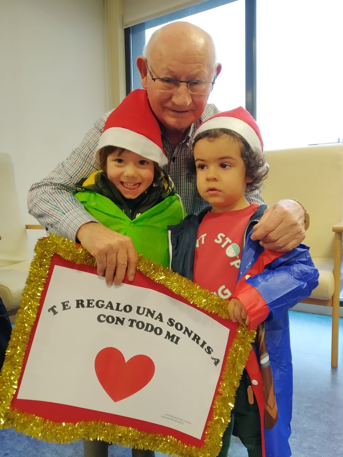 Hoxe os máis cativos do cole, o alumnado de 4º de infantil (3 anos diciamos antes) acompañados polas súas titoras e Jorge quixéronlle agasallar ós avós e avoas da residencia Santa Mariña, ós do Centro de día e á Garda Civil  un dos mellores regalos que se poden facer: O seu sorriso. Valaquí unhas imaxes desta actividade.